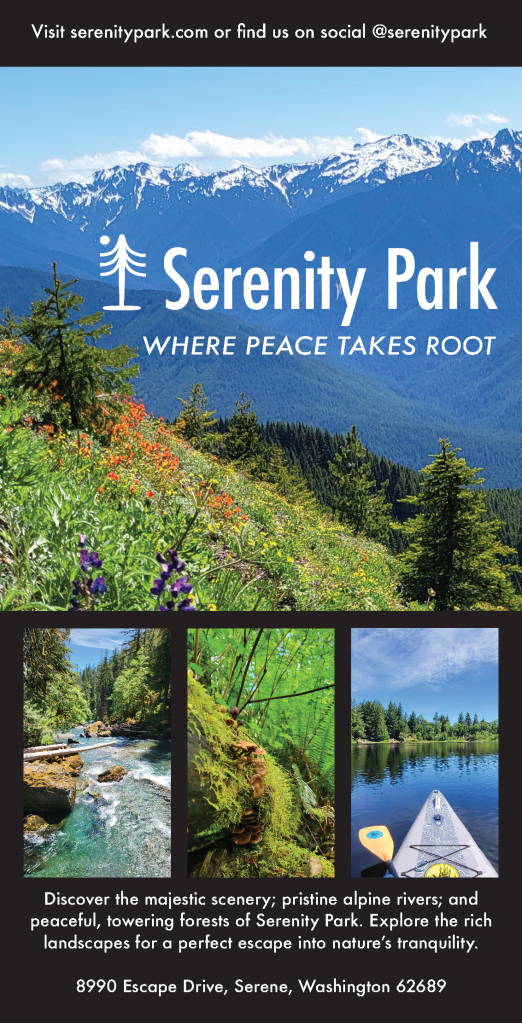 Text box: Find your peace Serenity Park logo graphic Text box: WHERE PEACE TAKES ROOT Text box: Visit serenitypark.com or find us on social @serenitypark